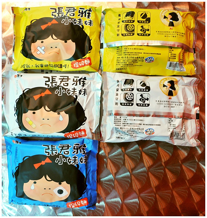 打開包裝後發現,張君雅脆麵以黃、白及藍色系作為包裝袋變化,除顏色外,主圖也有細部變化,這增加了一些樂趣。由於脆麵主打小學生市場,所以除了統一脆麵外,其餘科學麵與王子麵也都有兩種外袋包裝,只是顯然張君雅小妹妹有備而來,不只外帶圖案硬是多一種,連印刷都採用霧面,增加些許優雅質感。以下是照片,完 (笑)